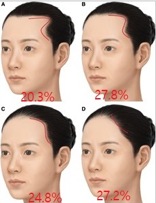 결과를 살펴보면, 여성에서는 이마선의 모습이 사각 36.1%, 삼각 7.2%. 원 38.5%, M자 18.2% 였습니다.