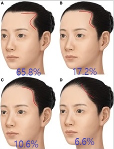 원형 이마선이 거의 40% 정도로 가장 많고, 그다음이 사각형 이마선이 비슷하게 많아 두 형태가 거의 대부분의 모습으로 보시면 될 것 같고, 약 20% 정도가 M자형 이마선, 그리고 가장 드문 형태는 삼각형 헤어라인이었습니다.