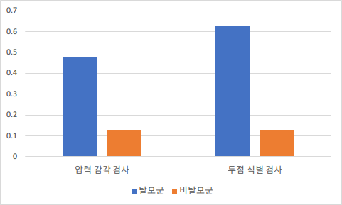 정수리 부위의 압력 감각 검사 결과는 탈모 환자군 중 48%가 이상 증상을 보인 반면 비탈모군은 13%에 불과했습니다. 같은 부위에 두점 식별 검사를 해보니 차이가 더 크게 벌어졌습니다. 각각 63%와 13%의 차이였습니다.