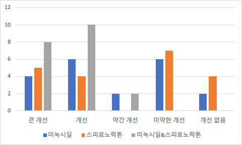 오늘 소개해드릴 연구는 알닥톤을 미녹시딜과 함께 두피에 도포했을 때 어떤 효과가 있는지 알아본 연구입니다. 60명의 남성을 세 그룹으로 나누어 그룹1은 미녹시딜만, 그룹2는 스피로노락톤만, 그룹3은 두 가지 약제를 모두 도포해서 탈모 치료 효과를 비교했습니다. 아래의 차트에서 보듯 미녹시딜과 스피로노락톤을 동시에 사용한 그룹에서 각 약물을 단독으로 사용한 그룹에 비해 더 좋은 결과를 얻었습니다.