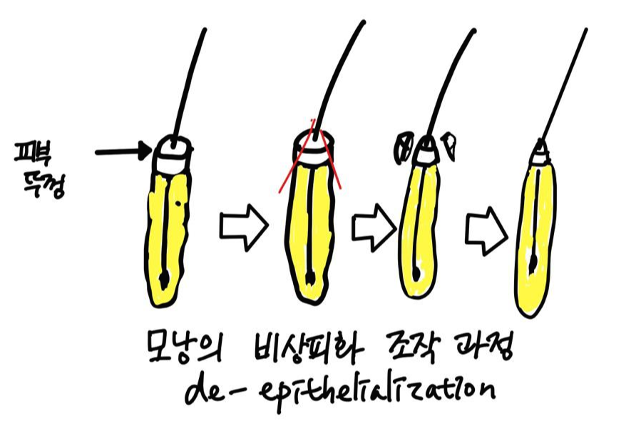 피부 부분을 다듬어 내는 이유는 이식 시 식모기, DNI 기기 등에 삽입하는 과정에서 바늘에 장착하기 편하게 하기 위해서입니다 피부 뚜껑이 있으면 이식기에 잘 들어가지 않거든요. 또 하나의 이유는 뚜껑이 있으면 모발이식 후 개구리알 (goose bumps)처럼 보여서 미관상 그리 좋게 보이지 않는 것도 있습니다. 수술 후 딱지 발생도 적어서 번거로움이 덜한 장점도 있습니다
