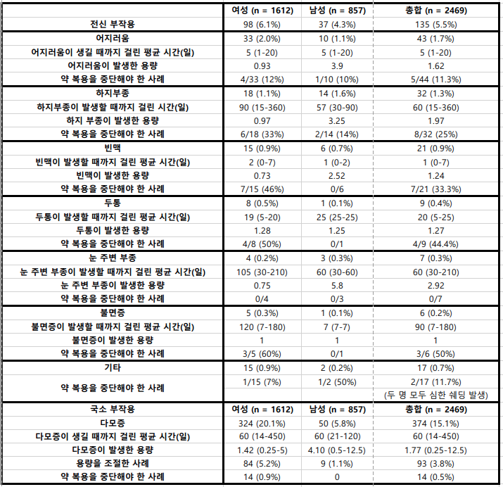 각 부작용이 발생한 시점에도 차이가 있었습니다. 약 복용 24시간 이내에는 빈맥, 일주일까지는 어지러움이 흔했습니다. 이후 20일까지는 두통, 그 이후로는 부종, 다모증 등의 부작용이 발생했습니다.