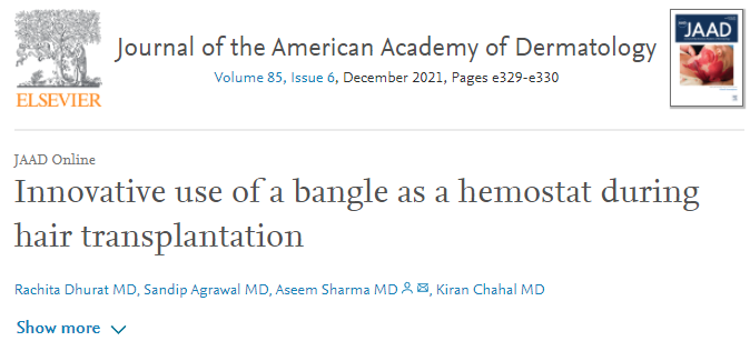 이 달 미국 피부과 학회지에 실린 연구입니다. 제목을 먼저 살펴보겠습니다. 뱅글 팔찌를 헤모스텟(지혈을 위해 혈관을 집는 집게)과 비슷한 용도로 사용할 수 있다고 합니다. 이 저널에 실린 연구 가운데 제목이 곧 내용인 것으로는 다섯 손가락 안에 들어갈 것 같습니다. 바로 사진을 보시겠습니다.