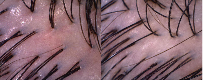 엑소좀과 보톡스를 이용한 모낭주사치료의 효과가 모발 확대경 상 어떻게 나타나는지 알아보겠습니다. 6개월 간 주사치료와 최근 2개월 동안 경구 미녹시딜을 사용하신 분의 소견입니다. 사진