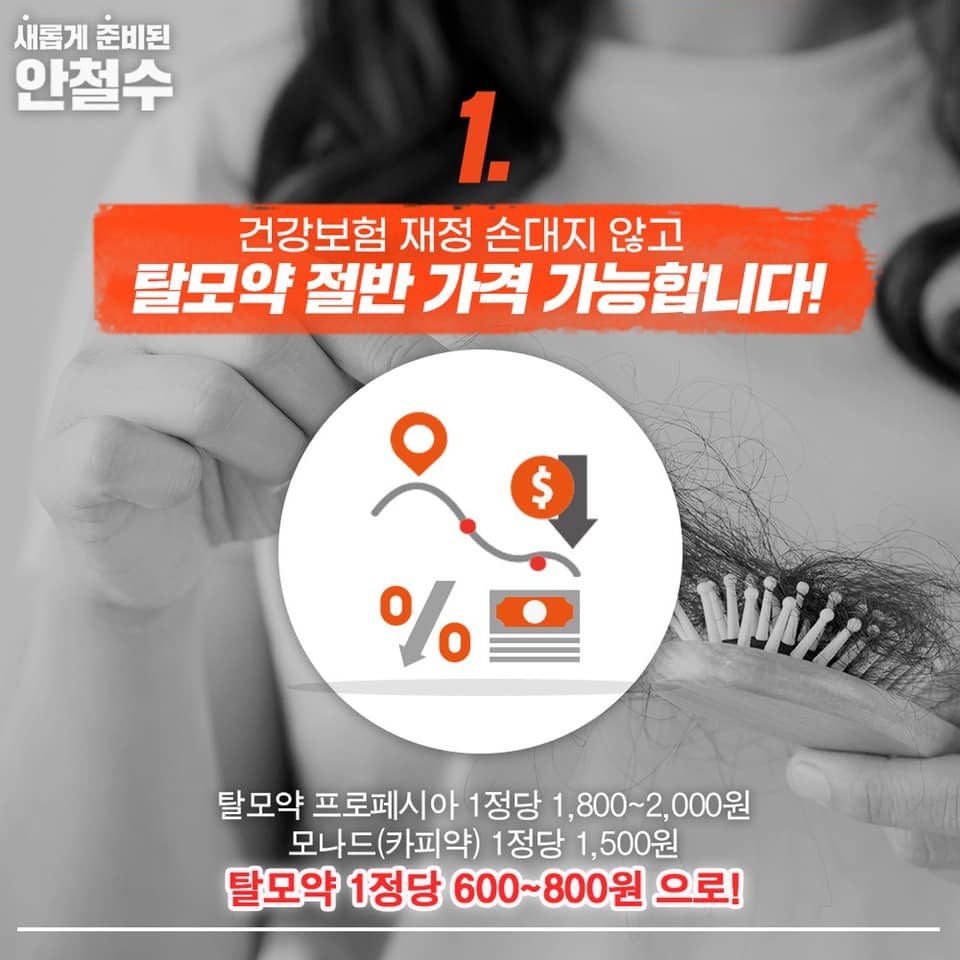 안철수 후보는 카피약 가격을 낮춘다는 공약을 제시했습니다. 어떻게 낮출지 방법은 구체적으로 제시하지 않았지만 탈모약 가격이 낮춰진다는 것은 결론적으로 탈모인들에게 도움이 될 것입니다. 그런데 1 정당 카피약 600~800원으로 떨어뜨린다고 하셨는데 이미 탈모약을 저렴하게 파는 약국들이 있는 종로, 영등포, 강남역 등에서는 이미 1 정당 350~500원인 카피약이 많이 있습니다. 물론 이 가격보다 더 낮춰지면 좋겠지만, 더 낮출 수 있을까 하는 의구심이 드네요.