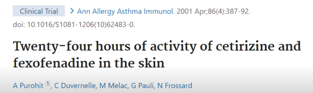 위 연구는 로라타딘 10mg 복용 vs 펙소페나딘 180mg 복용 후 피부에서의 염증반응, 팽진과 발적 완화 효과를 비교한 연구입니다. 결론은 알레그라(펙소페나딘)가 더 효과가 빠르게 나타났고, 효과가 더 좋았습니다. 알레그라는 복용 후 1-2시간 부터 약 효과가 나타나는 반면에 로라딘(로라타딘)은 복용 후 4-6시간 후부터 효과가 나타났습니다. 뿐만 아니라 알레그라는 팽진과 발적에 모두 유의미한 반면에 로라딘은 피부 팽진을 줄여주는 데는 효과가 미미했습니다.