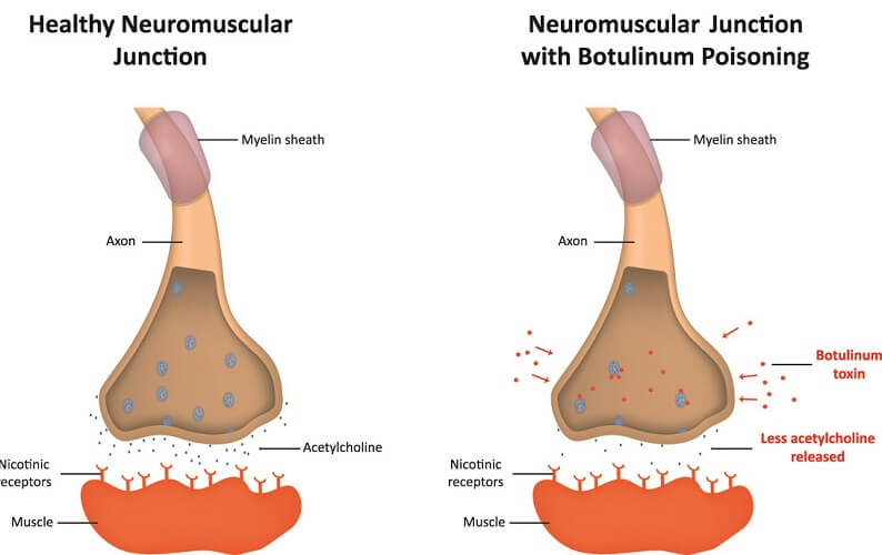 보톡스는 기본적으로 신경세포의 말단 신경전달 물질인 "아세틸콜린"의 분비를 억제하면서 근육수축을 억제하고, 땀 분비를 억제합니다. 운동신경의 신호전달을 억제함으로써 근육 수축이 줄어들고, 그 결과 사각턱이 갸름한 턱으로 변하게 됩니다. 교감신경의 신호전달을 억제함으로써 땀 분비가 줄어들고, 그 결과 두한증이 완화되는 것인데요, 이런 억제 효과는 일반적으로 3개월에서 6개월 정도 지속되게 됩니다.