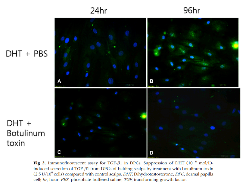보시는 것처럼 보톡스를 주입한 모유두세포에서는 형광반응이 감소했습니다. TGF-b1가 적다는 것이죠.