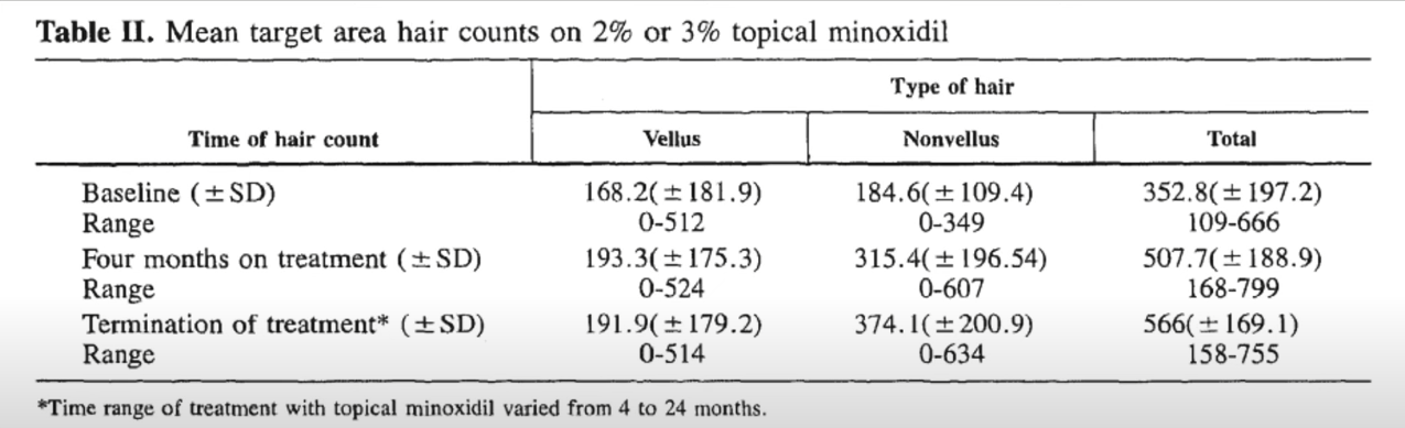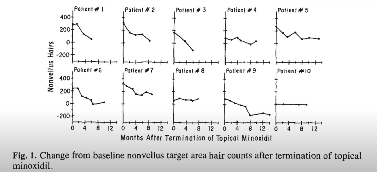 미녹시딜은 12개월 이상 꾸준히 사용했던 30-40대 남성 10명을 대상으로 미녹시딜 중단 실험을 하였으며, 중단 후 매 2개월마다 단위 면적당 모발의 개수를 평가하였습니다.