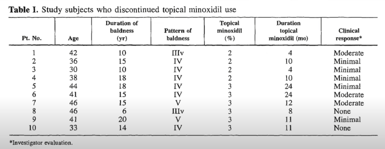 위의 표에서 보시는 것처럼 중단 후에도 전혀 반응이 없었던 Patient #8, #10은 미녹시딜에 반응이 없었던 것을 확인할 수 있고 나머지 분들은 미녹시딜에 효과가 있었기 때문입니다.