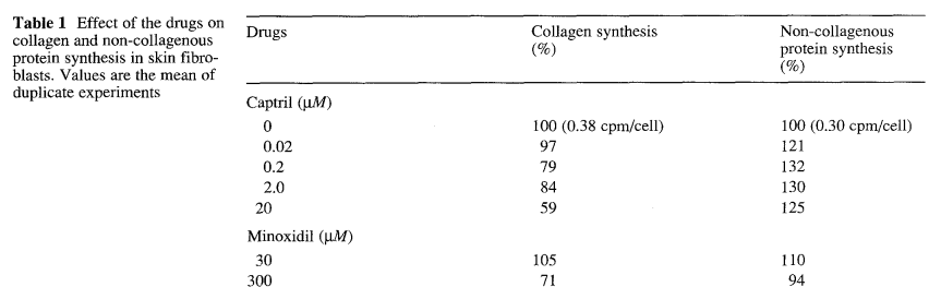 표에서 보시는 것처럼 미녹시딜의 농도가 10배 증가했을 때 콜라겐 합성 정도가 비콜라겐성 단백질 합성에 비해 확실히 저하되는 것을 확인할 수 있습니다. in vitro 실험이긴 하지만 확실히 미녹시딜이 콜라겐 합성에 영향을 주는 것을 판단할 수 있는 연구죠.