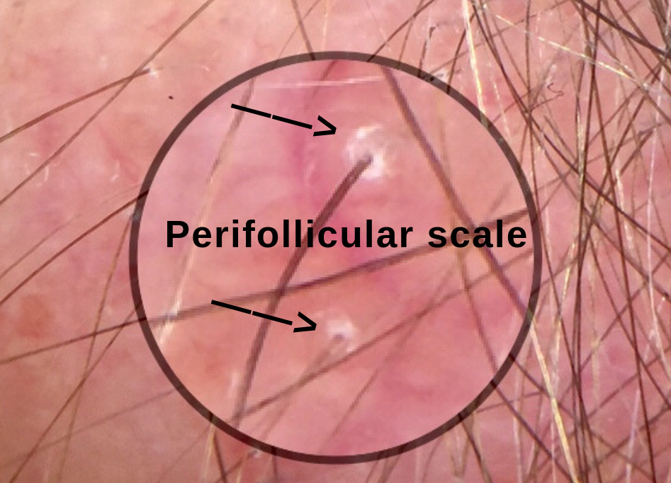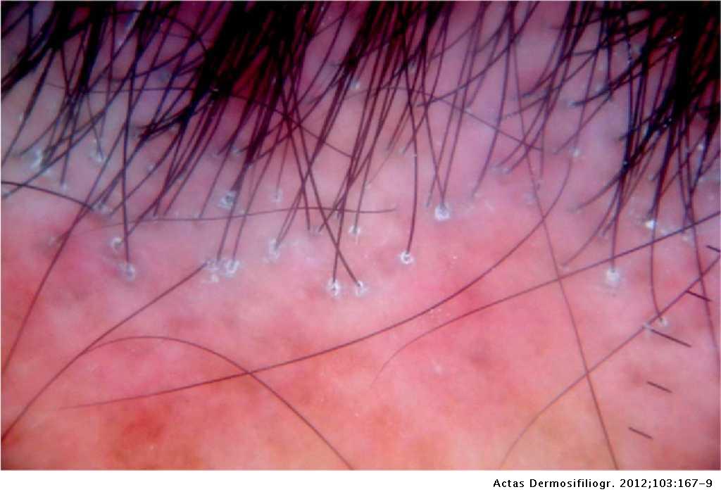 전두 섬유성 탈모(FFA)의 경우는 갱년기 여성, 폐경 이후 여성에서 잘 관찰되지만 젊은 여성, 남성에서도 충분히 생길 수 있습니다. 자가면역 질환, 비염 등 알러지를 자주 보이는 분들에서 더 잘생길 수 있고, 두피현미경(Dermoscopy) 검사 상 모낭 주변을 둘러싼 하얀 인설(Perifollicular scale)을 보이는 것이 특징적인데요,