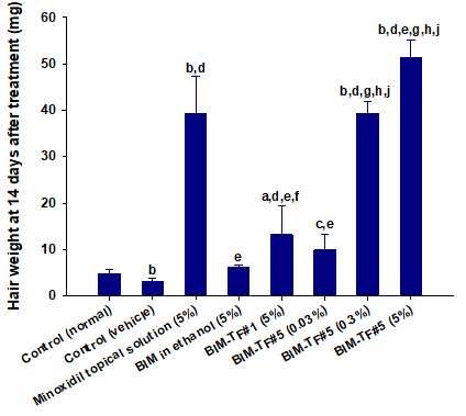 이렇게 실험한 결과, 일반 휘발성 용매 비마토프로스트, 기존의 도포 탈모 치료제 미녹시딜과 비교했을 때 상대적으로 더 좋은 탈모 치료 효과를 보였습니다.