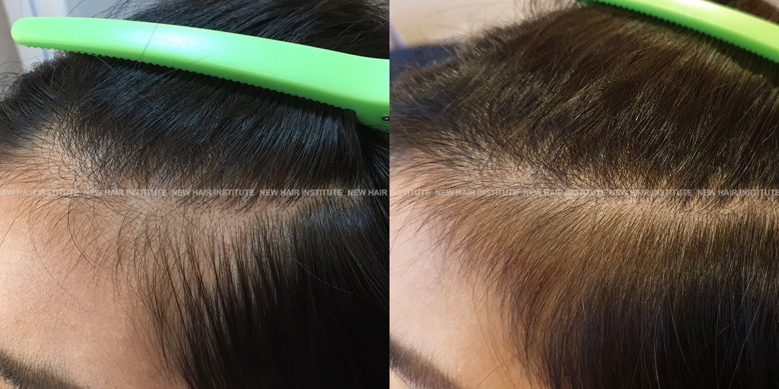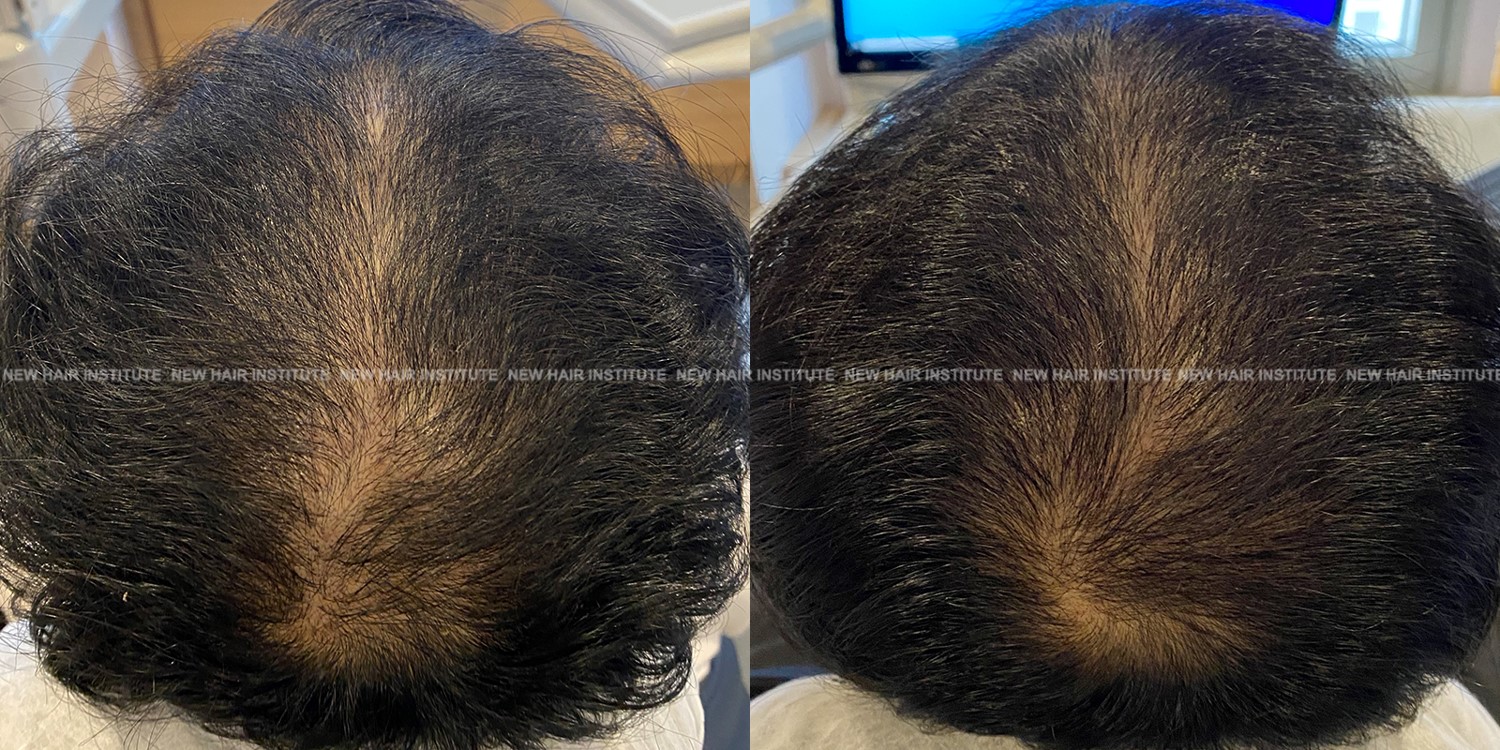 확산성 탈모, 여성형 탈모, 스트레스성 탈모 등에서는 치료약의 종류가 남성에서보다 한정되기 때문에 모낭주사 치료의 필요성이 좀 더 높아집니다. 바르는 약 미녹시딜과 모발 영양제인 맥주효모 정도가 여성 탈모에서 쓸 수 있는 약들인데 이 약만으로 큰 치료효과를 기대하기는 어렵기 때문입니다. (아래 사례 사진에 여성 탈모 사례를 보실 수 있습니다.)