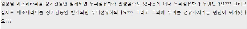 두피섬유화란 조직이 가진 원래의 피부조직이 아니라 흉터 조직처럼 피부의 타입이 바뀌는 것을 의미하며, 결국 두피 내에서 모낭이 없어지기 때문에 모발이 올라오지 못할 수 있게 됩니다. 다만 섬유화 되는 두피의 치밀도나 두께 등에 따라서 모발이 다시 올라와줄 수도 있고 아닐 수도 있습니다. 화상이나 깊은 상처 등이 생겼을 경우 두피 조직이 섬유화 되어 피부의 타입이 변형될 수 있습니다. 모낭주사 시술을 어떻게 하느냐에 따라 다르겠지만, 보통 아주 가는 바늘을 이용해 주입하고, 주입 깊이도 4~5 mm 내외로 얕기 때문에 이 시술로 두피 섬유화가 될 정도의 흉터를 만들기는 어렵습니다.