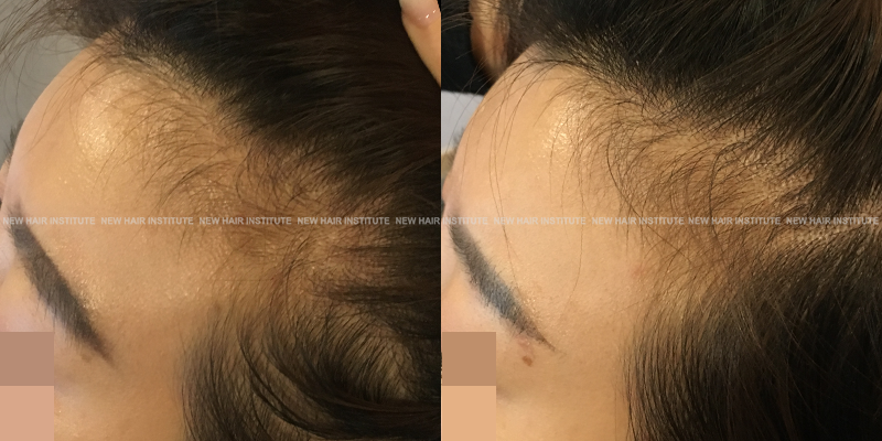 탈모치료 용도 뿐아니라 여성에서 잔머리 카락이 나는 효과도 기대해볼 수 있습니다. 잔머리가 별로 없거나, 나이가 들면서 잔머리가 줄어든 헤어라인 부근에 시술을 하면 잔털이 증가합니다. 위 사진은 저희 직원에서 시술한 결과 사진입니다. 전부터 '애교 잔머리' '김연아 잔머리' 시술을 원하시는 분들이 많았는데, 이렇게 미용적 목적으로도 쓸 수 있습니다.