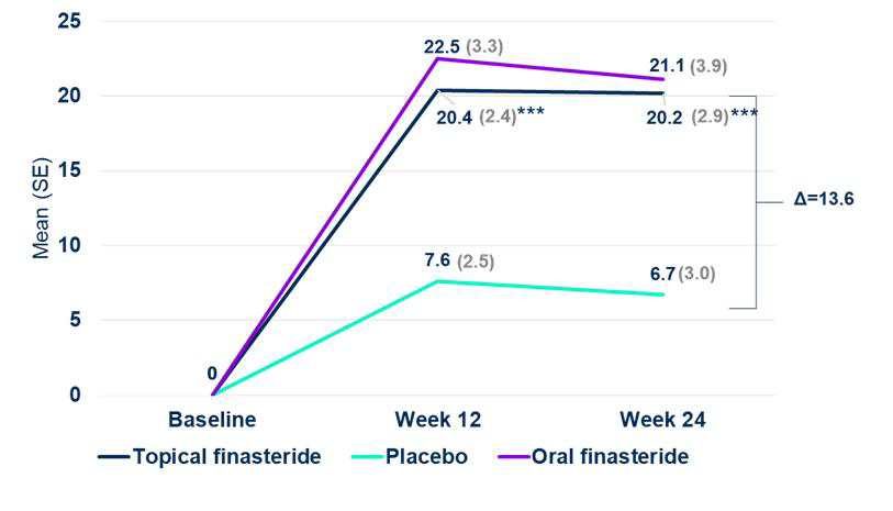 3. 3상 연구 결과가 최근 이탈리아에서 막 공개되었습니다. 458명을 대상으로 무작위 이중 맹검 방식으로 24주(6개월) 뒤의 효과를 비교하였습니다. 바르는 피나스테리드는 약을 쓰지 않았던 위약 군과 비교해서 분명히 효과가 있었고, 먹는 피나스테리드와 비교했을 때도 비슷한 효과가 있었습니다. 전문가 견해로는 12주 차부터 효과가 나타났고, 복용을 하는 환자군은 24주 정도 지났을 때 효과를 느꼈습니다.