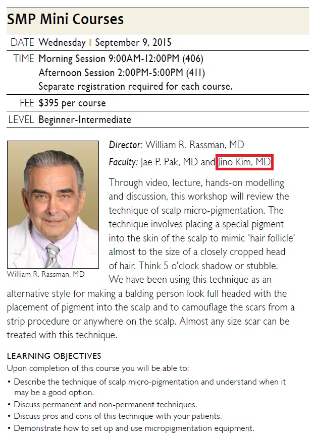 SMP(Scalp Micropigmentation, 두피문신)는 4년 연속으로 초청되서 발표를 하고 있습니다. NHI뉴헤어 LA의 라스만(Rassman) 박사가 전체 프로그램을 구성하였고, Dr. Pak과 제가 발표 및 시연을 하기로 하였습니다. 저번 3년의 강의와는 다르게 이번엔 참여한 의사 선생님들이 직접 실습을 해볼 수 있는 라이브 코스가 추가되었습니다. 조직 위원장인 Dr. Farjo에 의하면 작년 강의가 반응이 좋아 라이브 강의로 바꾸었다고 합니다.